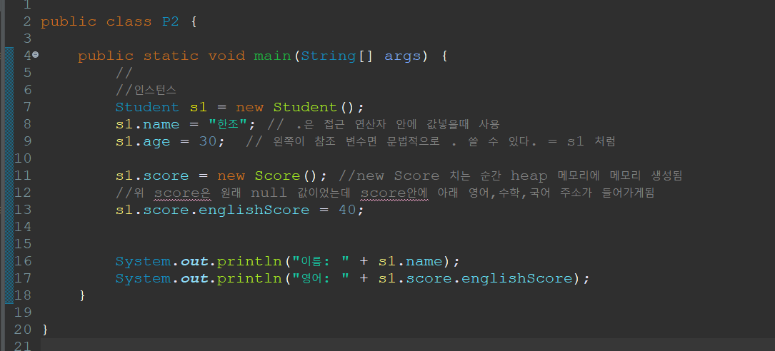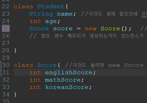 이렇게 쓰게되면 인스턴스 new Student(); 하게되면 연쇄적으로 가능해서 새로 메인 메소드에서 new Score 안써도 가능