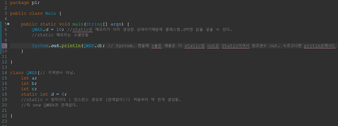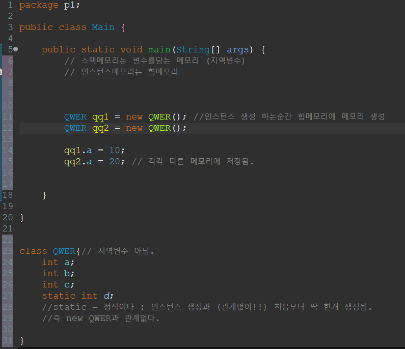 QWER의 멤버변수(멤버 메소드)인건 맞지만 인스턴스 변수가 아니다.!!
