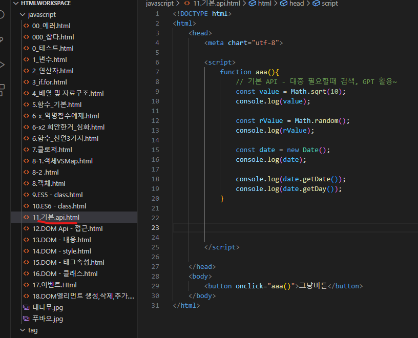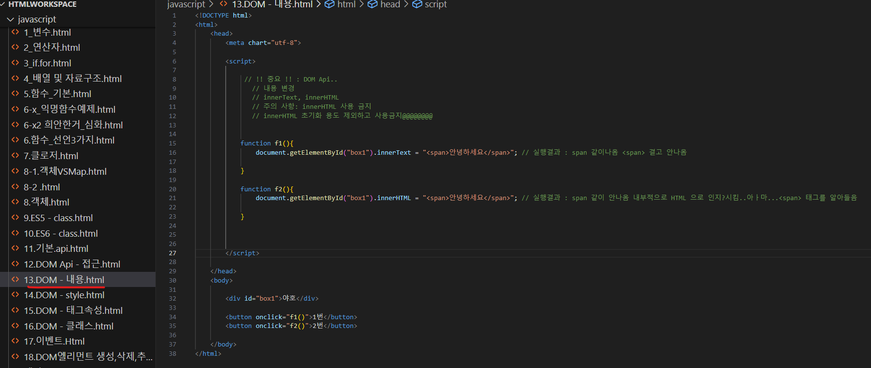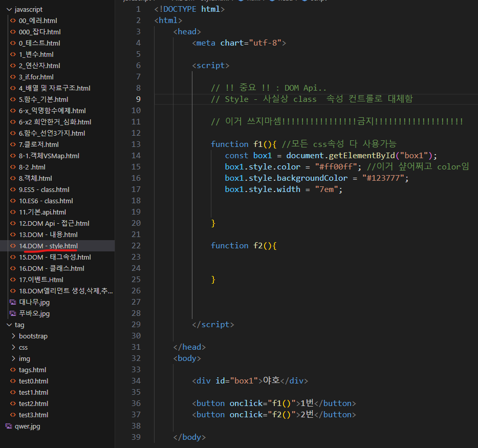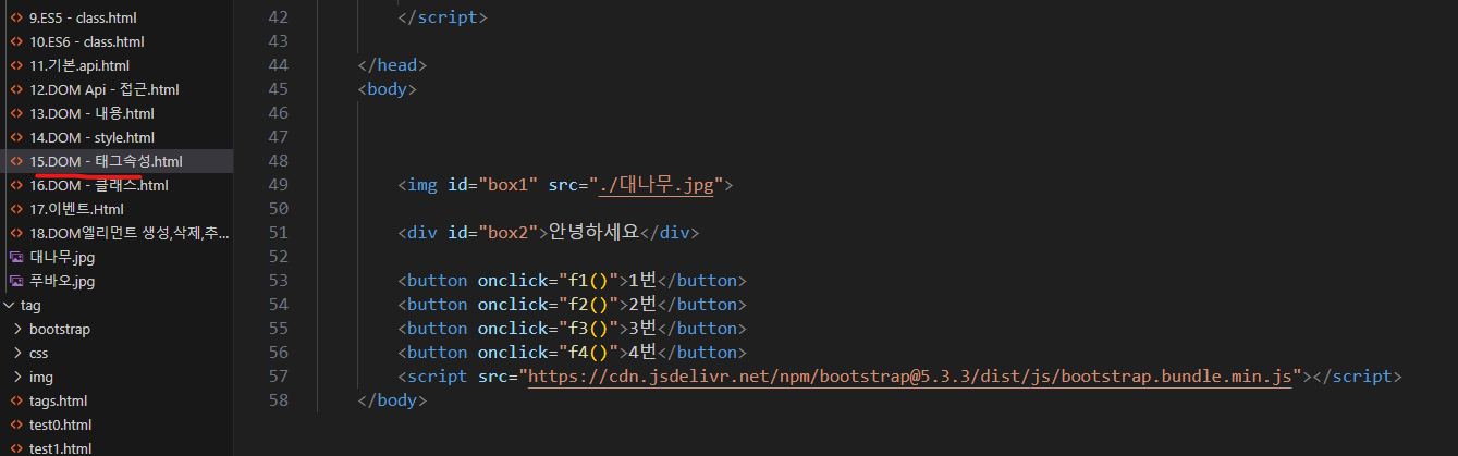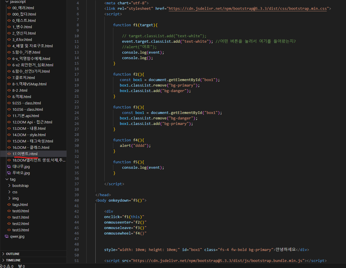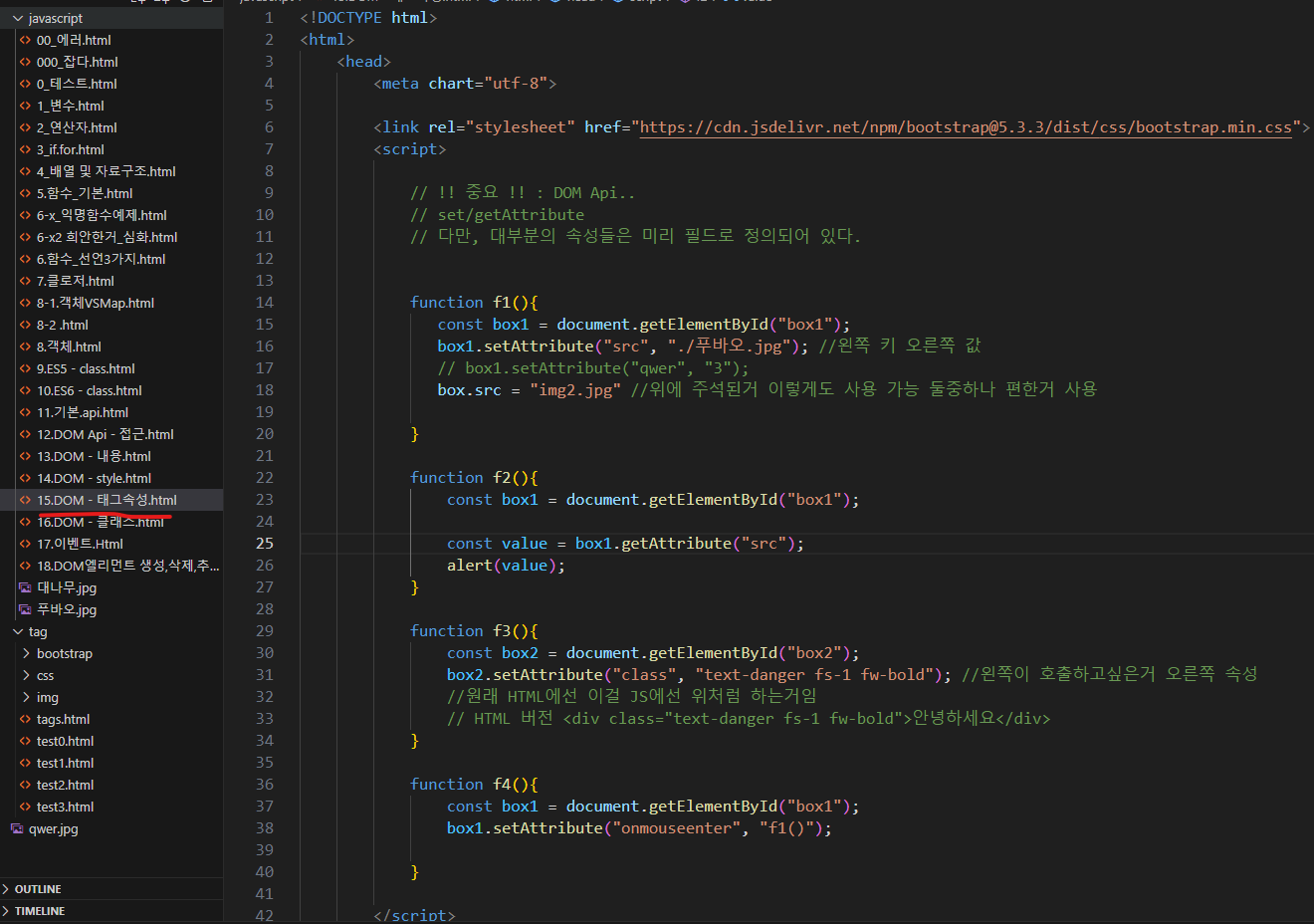 바닥부터 시작하는 프로그래밍/국비 - HTML, CSS, 부트스트랩, 자바스크립트 36일차 (DOM 알아야하는것들) 예얀 2024. 4. 25. 17:29 이건 걍 대충넘겨도 ㄱㅊ DOM api 접근 (상단부분) DOM api 접근 (하단부분) DOM 내용 DOM - style (이대로 안씀 사용XXX) DOM - 태그속성 (상단부분) DOM - 태그속성 (하단부분) DOM - 클래스 이벤트 엘리먼트 생성,삭제,추가 (상단부분) 엘리먼트 생성, 삭제, 추가 (하단부분)